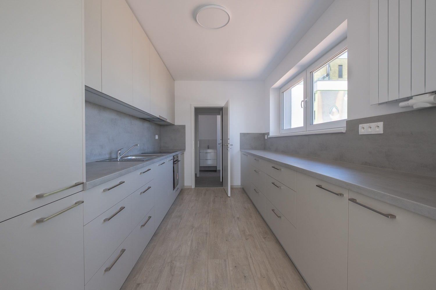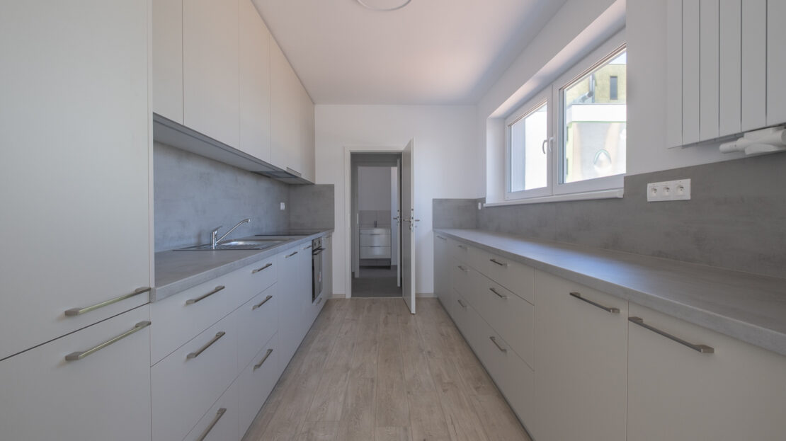 The apartment is rented unfurnished, allowing tenants to furnish it according to their own preferences. It includes built-in wardrobes, a washing machine, and a fully equipped kitchen with built-in appliances such as a dishwasher, fridge with freezer, electric oven. Air conditioning and washing machine is also included.