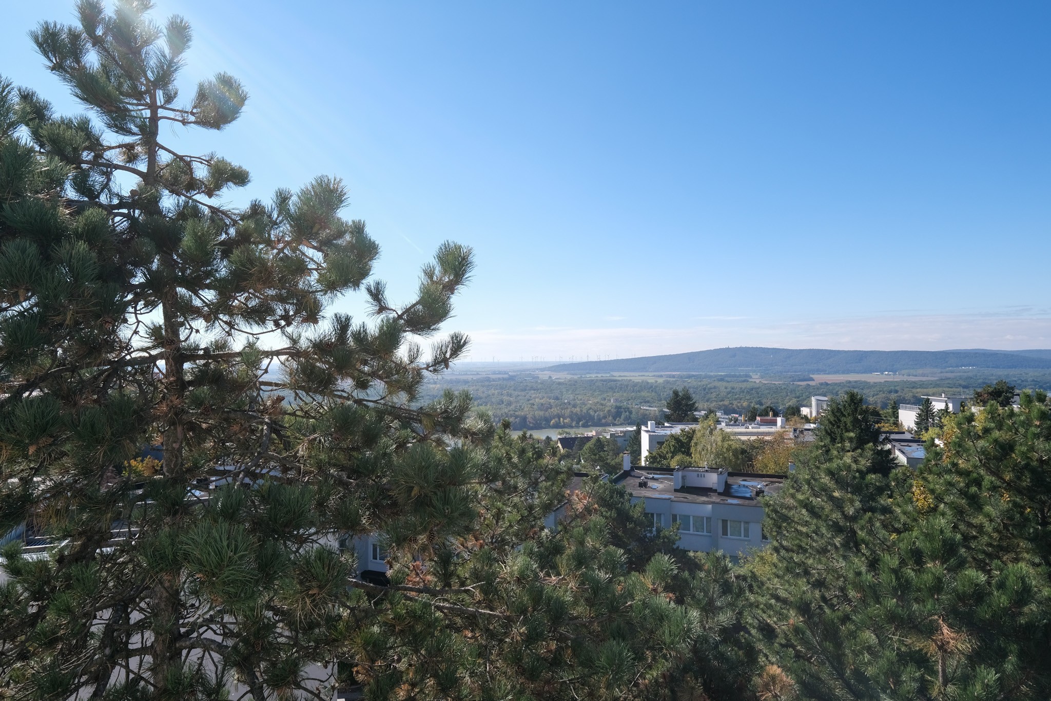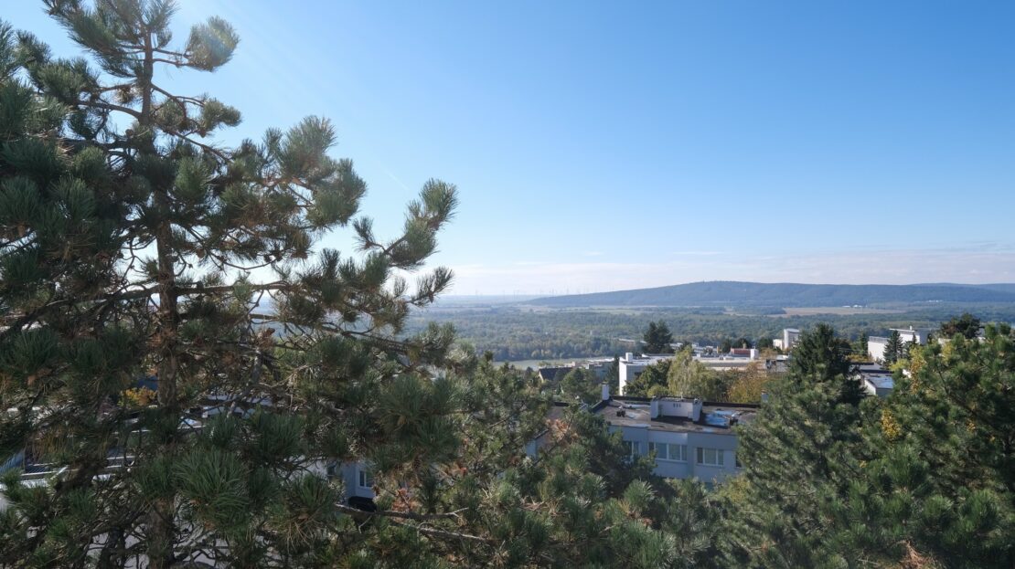 The terrace, accessible along the entire side of the apartment, offers breathtaking views of the Danube River and neighboring Austria.